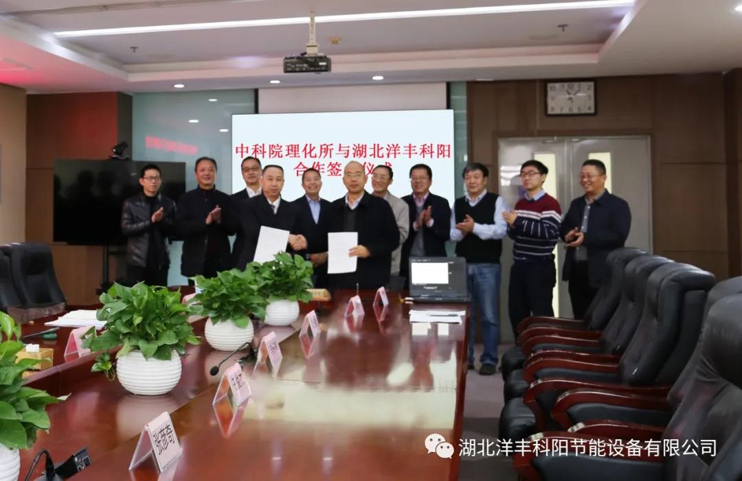 近日,公司与中国科学院理化技术研究所达成技术合作协议并在北京中关村签署了《热泵干燥技术研究开发合同》。中国科学院理化所副所长刘新建,新洋丰总裁黄镔、公司董事长赵大富、总经理邓安福出席签约仪式并讲话。