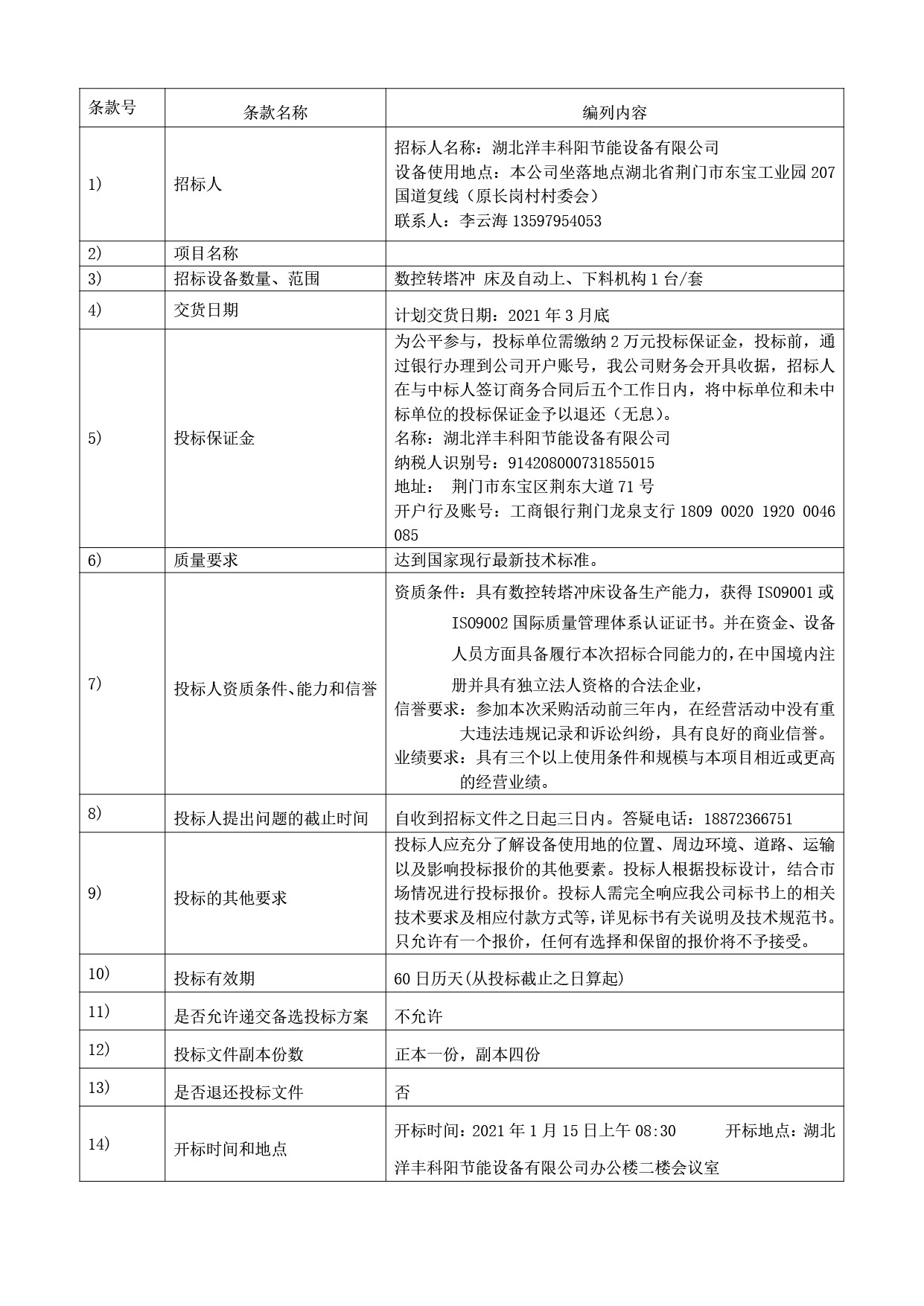湖北洋丰科阳节能设备有限公司数控转塔冲床及自动上、下料机构招标公告