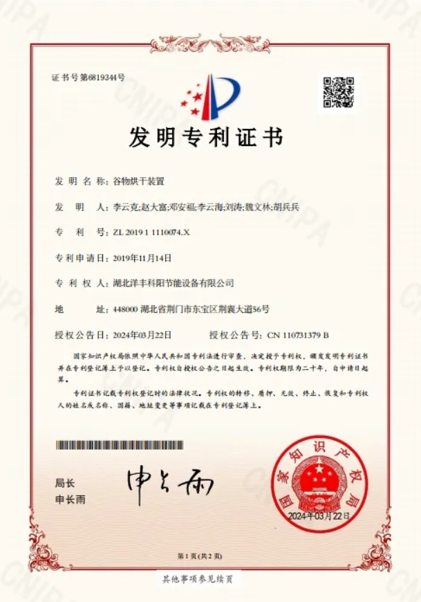 获得“谷物烘干装置”发明专利证书,充分证明了洋丰科阳在烘干装置技术上的领先地位。该专利技术使得烘干机在烘干谷物的过程中,能够更加高效、节能地完成工作,极大地提高了粮食烘干的质量和效率。